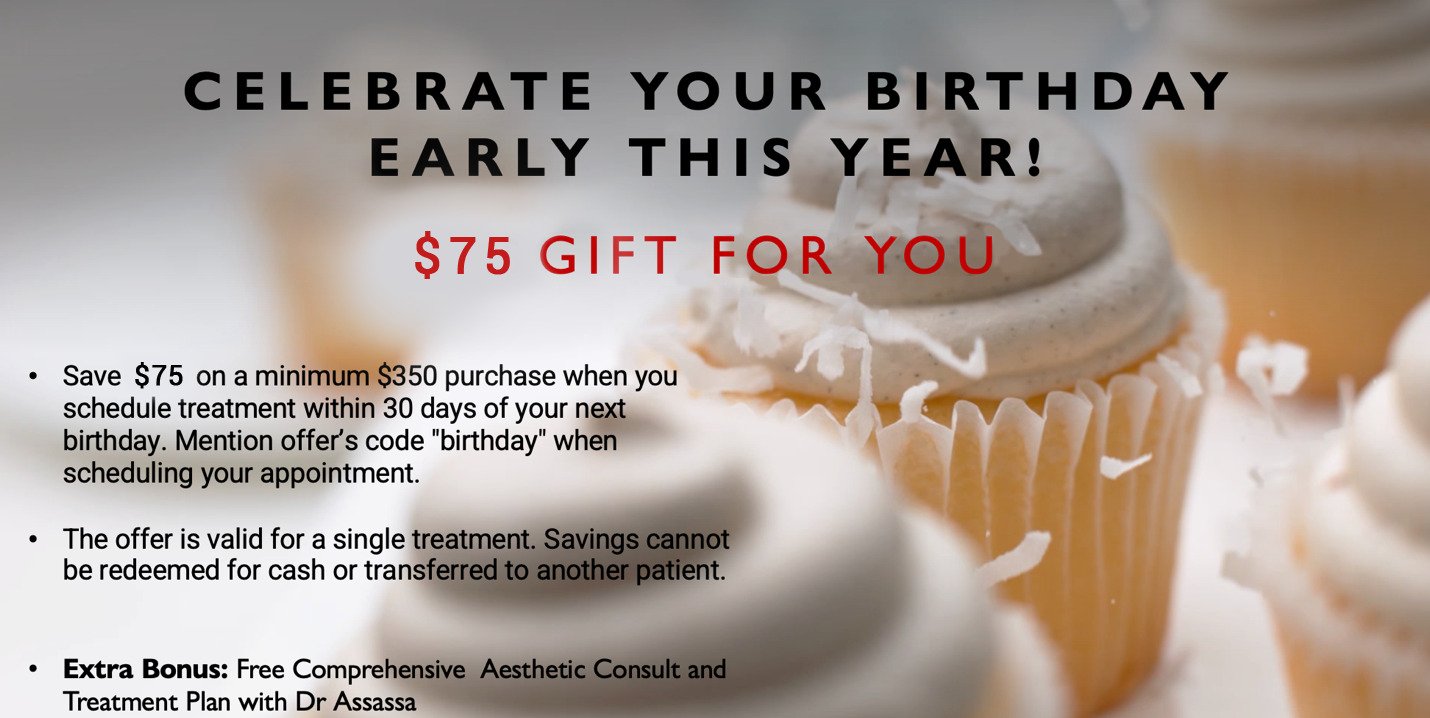 Celebrate your birthday early this year! $75 gift for you. Save $75 on a minimum $350 purchase when you schedule treatment within 30 days of your next birthday. Mention offer’s code “birthday” when scheduling your appointment. The offer is valid for a single treatment. Savings cannot be redeemed for cash or transferred to another patient. Extra Bonus: Free Comprehensive Aesthetic Consult and Treatment Plan with Dr Assassa